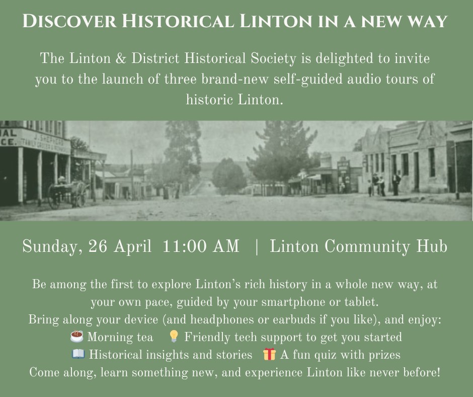 Our excursion will provide a narrative tour of Linton’s history. It will identify or visit old mining sites, churches, war memorials, former town facilities such as shops and businesses, the rifle range, railway station and slaughterhouse, and views of the town and surrounding landscape.